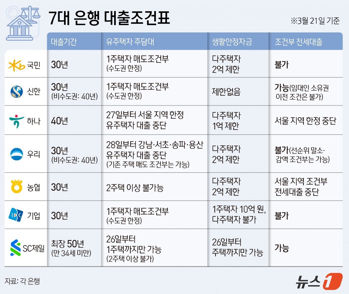 기업은행은 1주택자까지 10억 원 제한, 다주택자는 대출을 내주지 않는다. SC제일은행은 오는 26일부터 다주택자 대상 대출을 중단한다. 신한은행은 별도 제한이 없다.