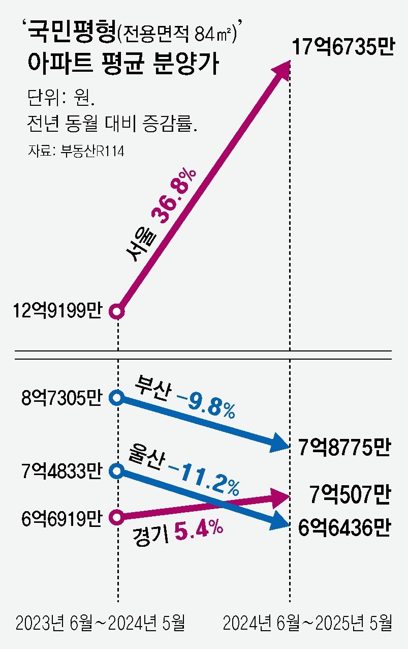 분양가 상승 폭도 서울이 가장 가팔랐다. 서울 평균 분양가는 직전 1년(12억9199만 원)보다 36.8% 올랐다. 전국 평균 상승률(14%)의 2.6배다. 경기(5.4%), 인천(5.1%) 등 다른 수도권과 비교해도 높은 수치다. 반면 울산(―11.2%), 부산·광주(―9.8%)와 대구(―9.5%) 등 부동산 경기 침체로 미분양이 쌓인 지방에선 오히려 분양가가 1년 전보다 내렸다.