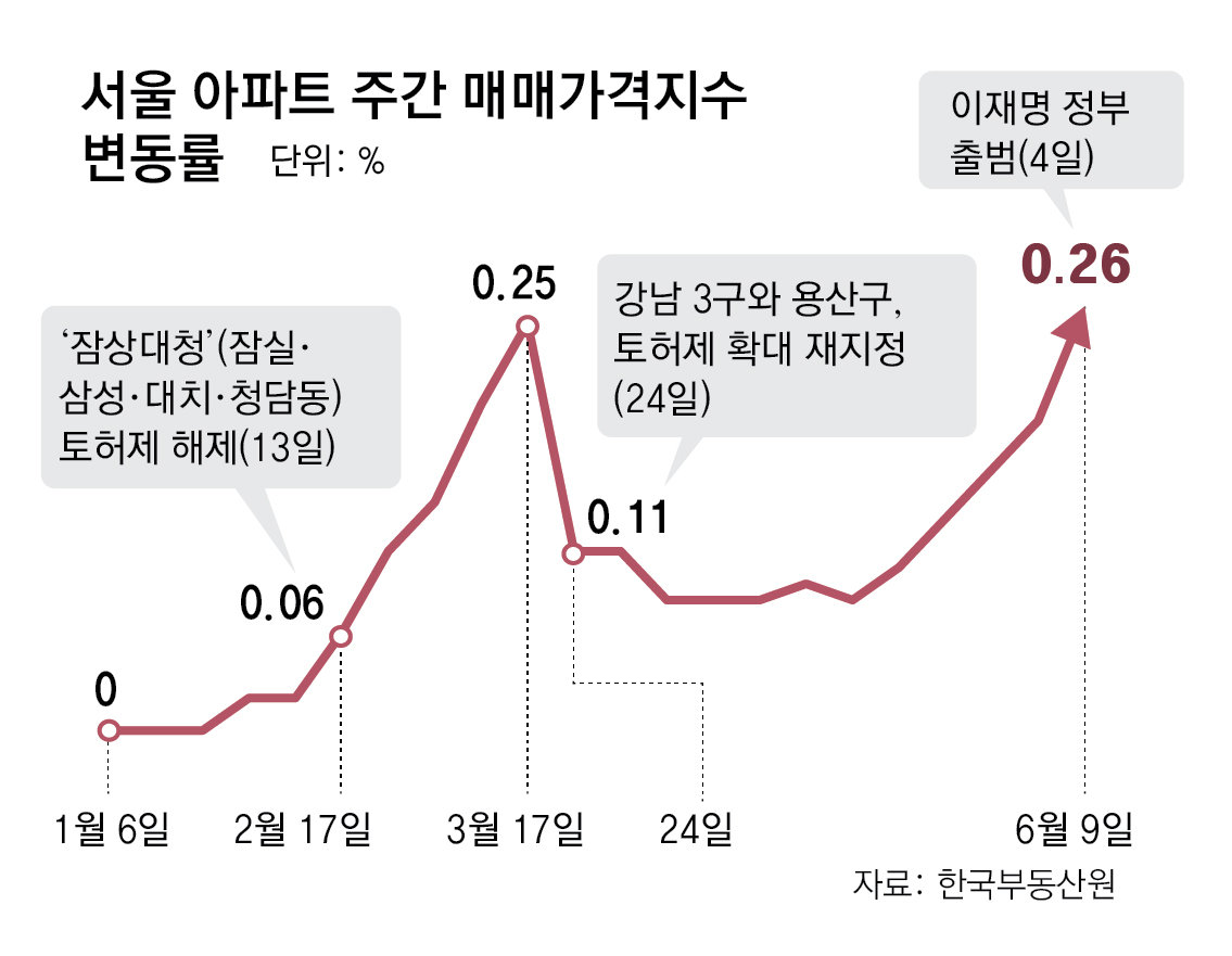 집값이 심상치 않자 정부는 12일 새 정부 출범 이후 첫 ‘부동산시장 점검 태스크포스(TF)’ 회의에서 “가용한 정책 수단을 총망라해 검토하겠다”고 밝혔다. 이준구 서울대 경제학부 명예교수는 14일 개인 홈페이지에 “지금 주택 시장에 부는 가격 상승 바람을 초기에 잠재우지 못한다면 집값 폭등은 필연적인 결과가 될 것”이라고 지적했다. 다만 이재명 대통령이 대선 과정에서 ‘세금으로 집값을 잡지 않겠다’고 밝힌 만큼 정부는 시장 안정을 위해 세금 규제보단 규제 지역 확대를 택할 가능성이 크다는 관측이 많다. 현재 규제 지역은 ‘강남 3구’(강남·서초·송파구)와 용산구뿐이다. 윤지해 부동산R114 리서치랩장은 “가격이 불안한 상황이라 정부가 규제할 여지가 커졌다”며 “시장을 규제하면 공급을 저해할 수 있어 균형을 찾는 게 관건”이라고 했다.