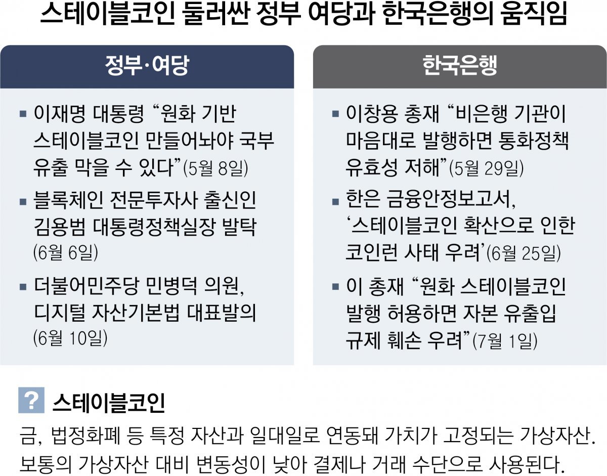 하지만 정부와 여권은 스테이블코인 도입에 속도를 내고 있다. 이 대통령은 대선 후보 시절인 5월 경제 유튜버들과의 대화에서 공약으로 내세웠던 스테이블코인 도입과 관련해 “원화 스테이블코인 시장을 만들어놔야 소외되지 않고 국부 유출을 막을 수 있다”고 말한 바 있다. 이 대통령이 당선된 이후에는 민병덕 더불어민주당 의원이 디지털 자산기본법을 대표 발의해 스테이블코인의 운영 근거를 마련했다. 이 대통령이 국내 최대 블록체인 전문투자사인 해시드 출신인 김용범 대통령정책실장을 발탁한 것도 정부의 도입 의지가 드러났다는 평가가 나온다.