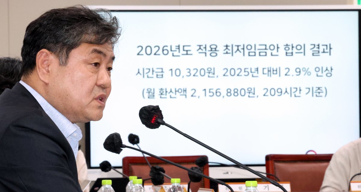 이인재 최저임금위원장이 10일 밤 세종시 정부세종청사에서 2026년도 적용 최저임금이 1만 320원으로 결정됐다고 밝히고 있다. 2025.07.10.뉴시스이후 한국노동조합총연맹 소속 근로자위원과 사용자위원이 2차례 수정안을 내며 의견차이를 좁혀갔고 결국 합의했다.