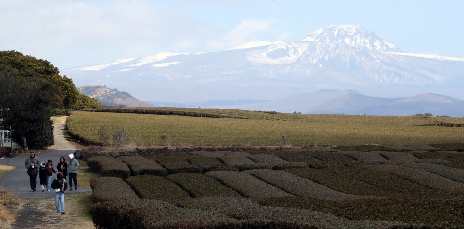 2월 21일 오후 제주 서귀포시 언덕면 오설록 녹차밭을 찾은 관광객들이 눈 쌓인 한라산을 배경으로 막바지 겨울 정취를 즐기고 있다. 2025.2.21/뉴스1