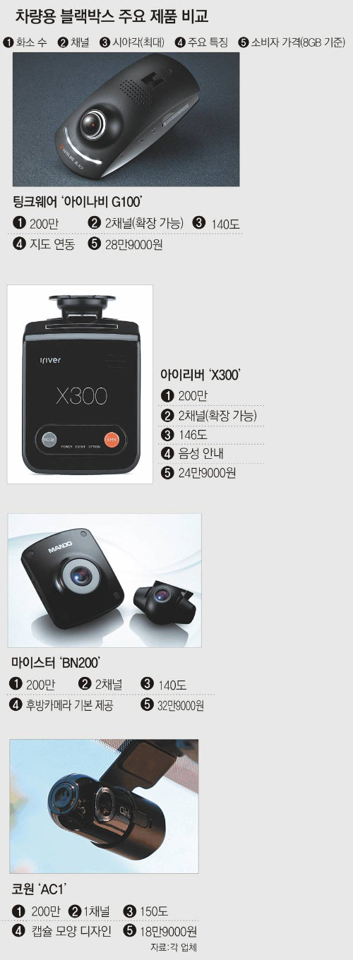 블랙박스의 인기에 제품을 생산하는 업체도 부쩍 늘었다. 현재 국내에서만 150여 곳이 블랙박스를 제조, 판매하는 것으로 추산된다. 과거 내비게이션이나 휴대용멀티미디어플레이어(PMP), MP3플레이어를 내놓던 팅크웨어, 파인디지털, 아이리버, 코원 등의 정보기술(IT)기기 전문업체들도 이 시장에 진출했다. 가격도 10만∼40만 원대로 다양하다.