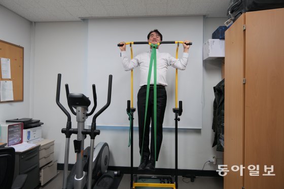 최승홍 교수는 주중에 4일 이상 연구실에서 기초 체력 운동을 한다. 팔굽혀펴기, 윗몸일으키기를 한 뒤 고무 밴드에 발을 걸고 턱걸이를 한다(위 사진). 마지막으로 일립티컬 머신을 활용해 30~40분 동안 유산소운동과 근력운동을 병행한다(아래 사진).
