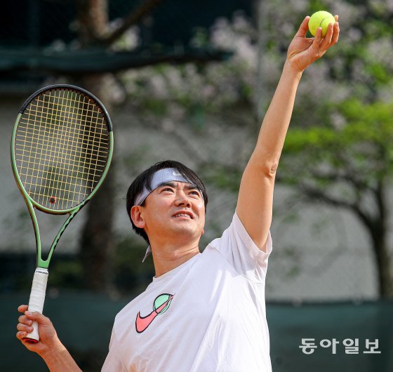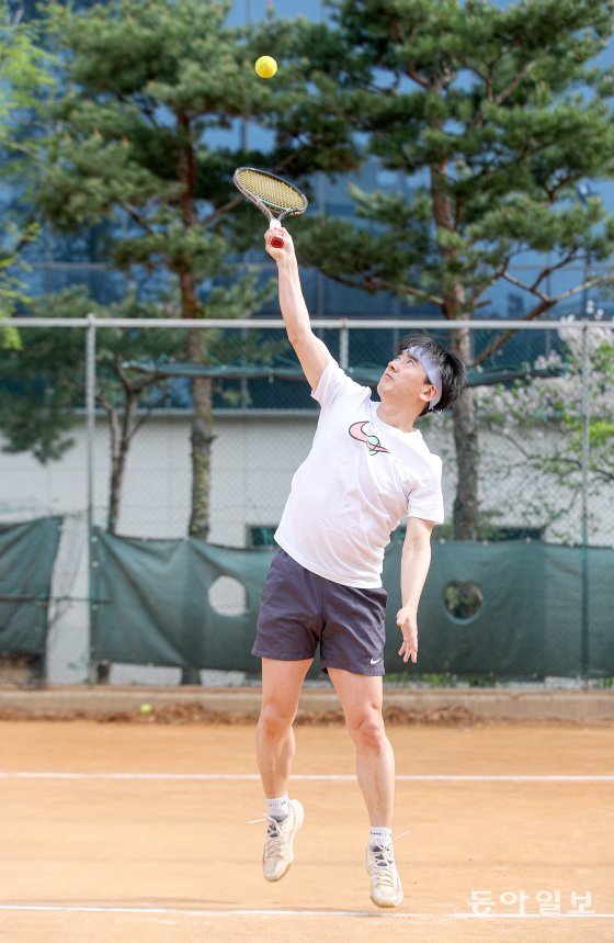 느낄 수 있어 좋은 운동이라고 했다. 최 교수가 병원 테니스장에서 서브를 넣고 있다. 송은석 기자