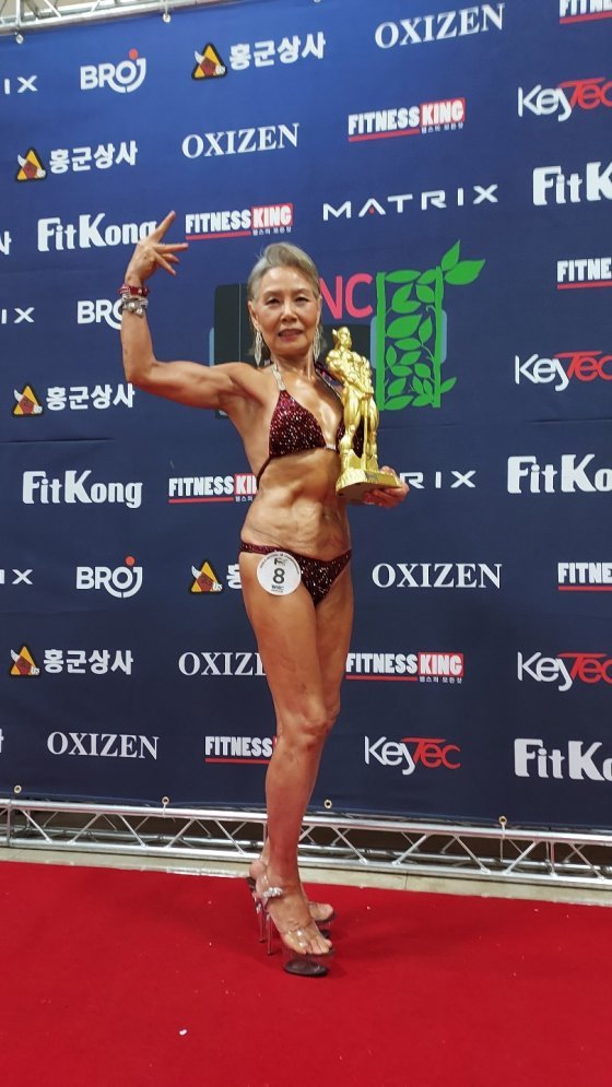 임종소 씨가 20일 열린 WNC 시그니처 보디피트니스대회에서 우승 트로피를 받고 있다. 임종소 씨 제공43kg이던 체중도 46kg으로 3kg 늘었다. 근육량이 많아지면서 나타난 현상이다. 35년간 에어로빅을 즐기던 임 씨는 그 때부터 웨이트트레이닝에 빠져 살고 있다. 그러자 건강과 행복이 따라 왔다. 유명세를 탄 뒤에는 시니어 모델로도 활동하고 있다. 56세 아들에 30세 큰 손녀까지 둔 ‘할머니’지만 나이를 잊고 살고 있다.
