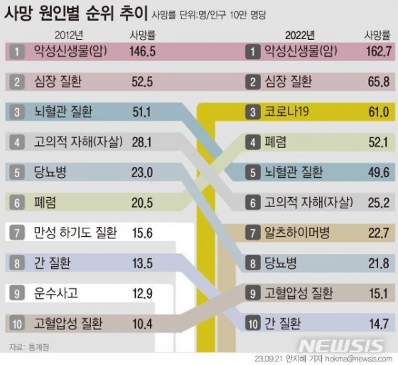 자살은 10대부터 30대까지 사망원인 순위 1위다. 40대와 50대에서는 사망원인 2위를 차지하고 있다.