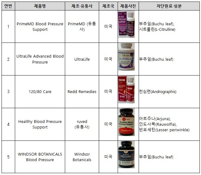 검사 결과, 혈압조절‧혈당 강하 관련 성분은 검출되지 않았으나, 22개 제품에서 국내 반입 차단 대상 원료‧성분이 표시된 것으로 확인됐다.