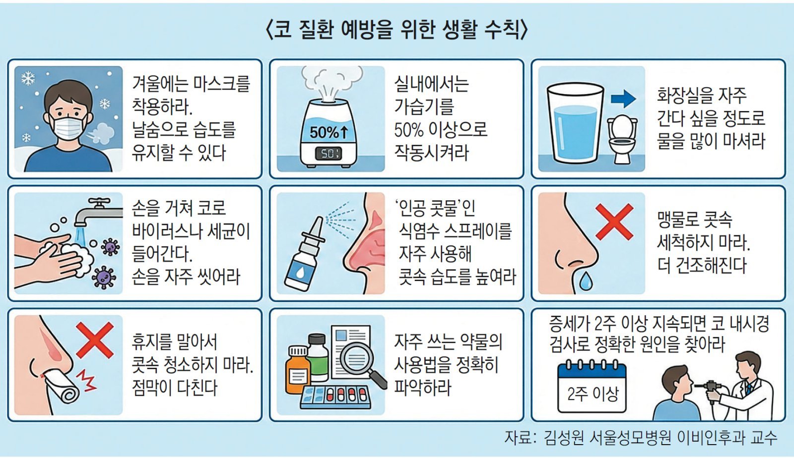 물로 콧속을 청소하는 건 피해야 한다. 수분을 보충하니 괜찮을 것 같지만 오히려 더 건조해진다. 맹물이 점액질의 수분을 빼앗기 때문이다. 딱지가 앉고 갈라져 피가 날 수 있다. 수영장의 물도 마찬가지다. 코 건강이 좋지 않을 때는 수영을 당분간 피하는 게 좋다. 콧속이 답답하다고 해서 휴지를 돌돌 말아 안을 닦아내는 것도 점막을 다치게 하는 행동이니 삼가자.