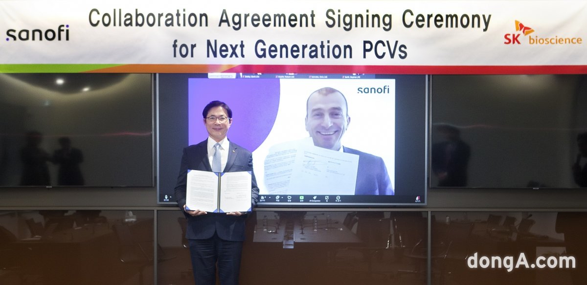 안재용 SK바이오사이언스 사장(왼쪽)과 장 프랑수아 투생(Jean-Francois Toussant) 사노피 백신R&D부문 글로벌 총괄담당이 화상으로 계약을 체결한 후 기념촬영을 하고 있다.현재 상용화된 제품보다 강력한 예방효과를 제공하는 영·유아 및 소아, 성인용 차세대 폐렴구균 백신을 개발해 시장 지형과 판도를 바꾼다는 목표다. 이를 통해 연간 글로벌 매출 수십조 원 규모 폐렴구균 백신 시장에서 선도적 지위 확보를 기대하고 있다.
