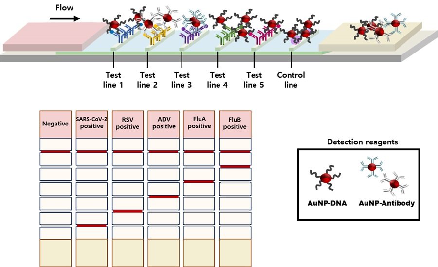 특히, 최근 독감과 RSV의 동시 유행으로 감염병 구분이 어려운 상황에서, 이 진단 키트는 하나의 검사로 동시에 다중 감염 여부를 확인할 수 있어 의료 현장에서의 활용도가 높을 것으로 기대된다. 기존 신속항원검사 (RAT)는 최대 세 가지 바이러스만 동시 검출 가능했으나, 이번 기술은 다섯 가지 바이러스를 육안으로 동시에 판별할 수 있다. 임상 검체를 이용한 실험에서도 위양성이나 교차반응 없이 안정적으로 바이러스를 검출하는 데 성공했다.