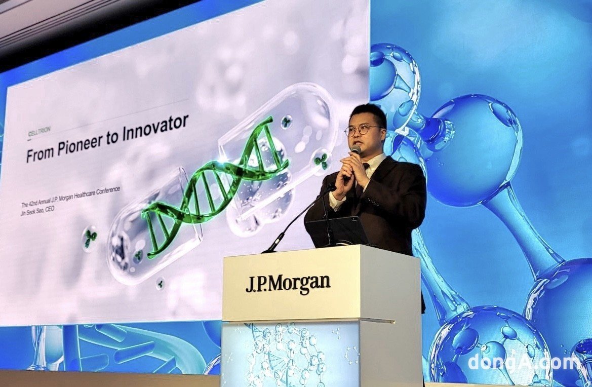 서정진 셀트리온그룹 회장이 작년 열린 2024 JP모건 헬스케어컨퍼런스에서 발언하고 있다.셀트리온은 서정진 셀트리온그룹 회장과 장남 서진석 셀트리온 경영사업부 대표이사가 오는 13일(현지시간)부터 미국 샌프란시스코에서 열리는 ‘2025 JP모건 헬스케어컨퍼런스(JPM)’에 함께 참가한다고 8일 밝혔다. JPM에서 이들은 셀트리온 미래 비전과 신약 개발 전략을 발표할 예정이다. 특히 이번 발표에서 셀트리온의 글로벌 신약 개발 기업 도약을 선포할 예정인 것으로 알려졌다.