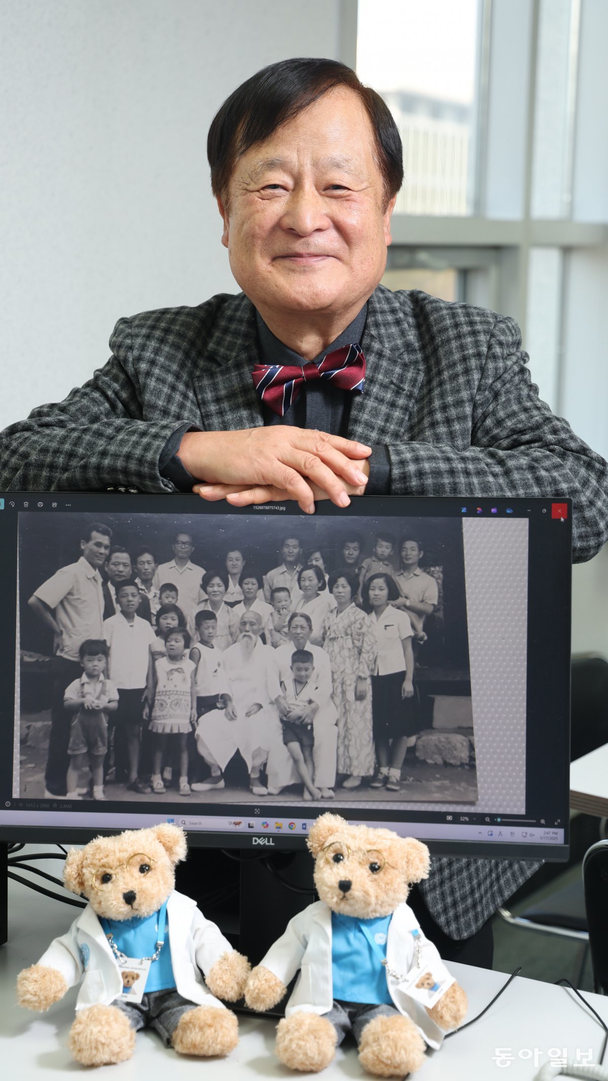 대학생 시절 외갓집에서 찍은 가족사진을 화면에 띄워봤다. 외조부모님이 중앙에 계시고 맨 뒷줄 오른쪽에서 다섯번째가 20대의 박 교수라고. 신원건 기자 laputa@donga.com