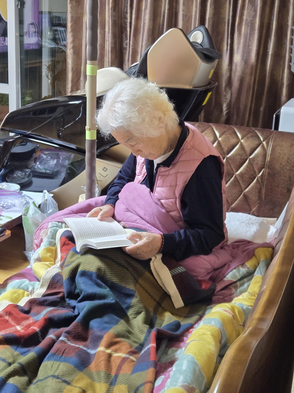 ‘백세엄마 여든 아들’을 읽는 어머니. 박교수는 어머니가 책을 받은 날 밤부터 즉시 독서에 돌입했다고 사진을 찍어 알려왔다. 책 내용에 대한 어머님 반응은 과히 나쁘지 않았다고. 박상철 교수 제공