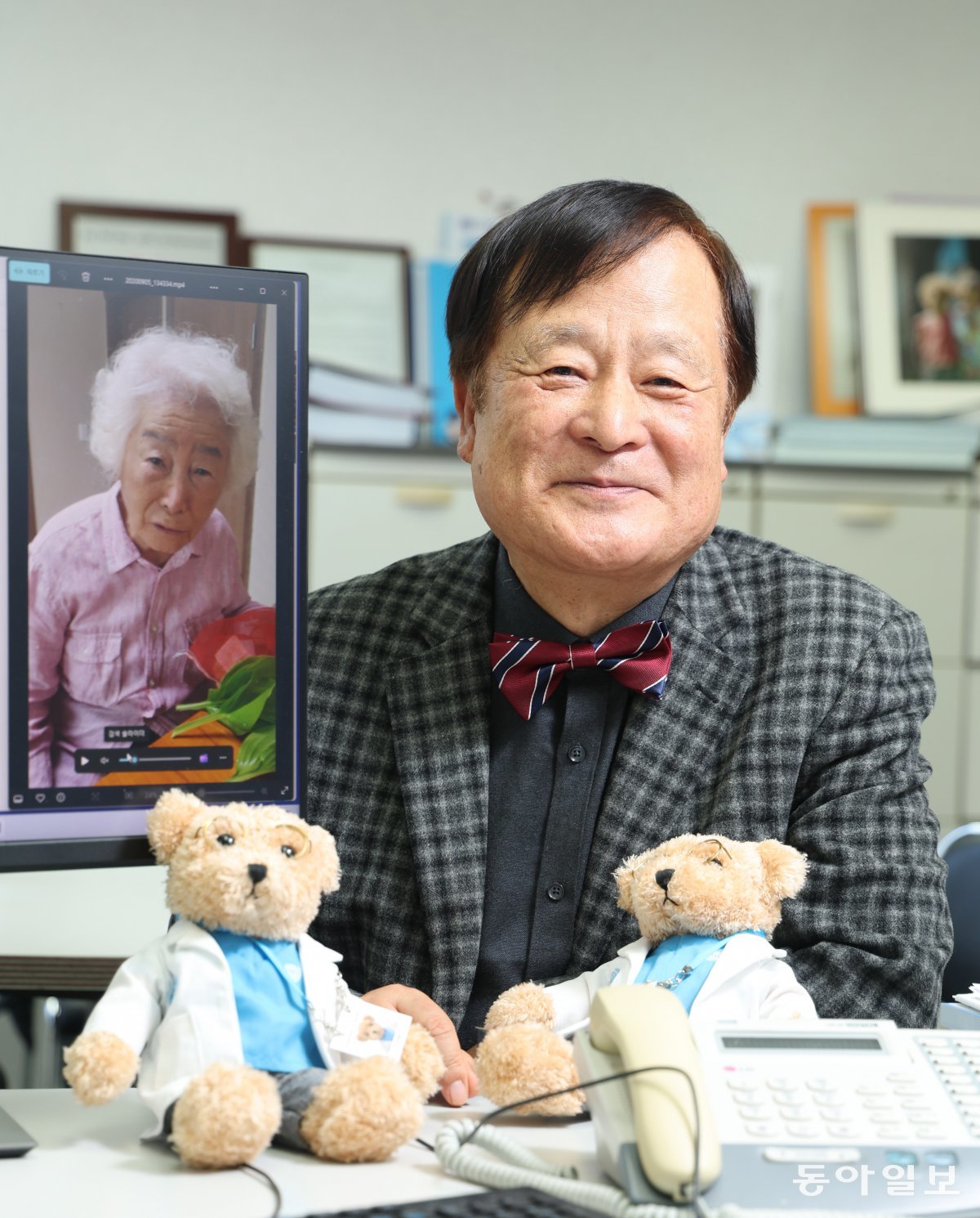 박상철 교수가 자신의 사무실에서 인터뷰에 응하고 있다. 왼쪽 컴퓨터 화면에는 어머니 모습을 띄워놓았다. 박교수 휴대전화에 저장된 손주와의 영상통화 동영상에서 따왔다. 신원건 기자 laputa@donga.com박상철(76) 전남대 연구석좌교수는 국내 노화장수 연구의 선구자다. 서울대 의대 생화학교실에서 세포 노화연구에 매진하다 1996년 서울대에 체력과학노화연구소를 만들었고 2000년부터는 100세인(人) 연구분야를 개척해 25년간 1500명이 넘는 100세인을 만났다.