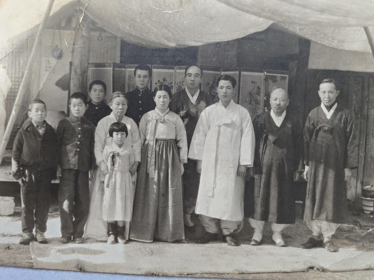 혼례를 마치고 재행길에 나선 처가에서 찍은 사진. 중앙의 젊은 부부가 박교수의 부모님이다. 사진속 아버지가 입고 계신 하얀 두루마기를 어머니는 70년간 고이 간직했다가 부군이 세상 떠나는 길에 입혀드렸다. 박상철 교수 제공