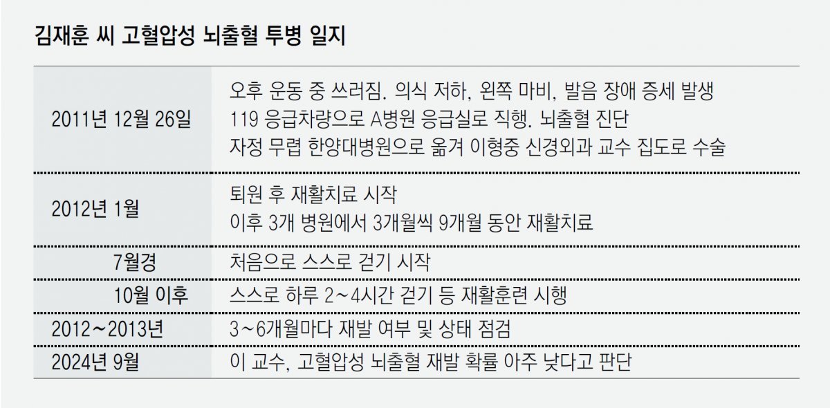 김 씨는 자신이 뇌출혈 환자가 될 거라고는 꿈에도 생각하지 못했다. 그도 그럴 것이 김 씨는 자타가 인정하는 운동 애호가였다. 조기 축구회, 조기 족구회에 가입해 꾸준히 활동했다. 지방자치단체가 주최한 축구대회에서 김 씨가 속한 축구팀이 우승하기도 했다. 김 씨는 야구 동호회에도 가입해 활동했다.
