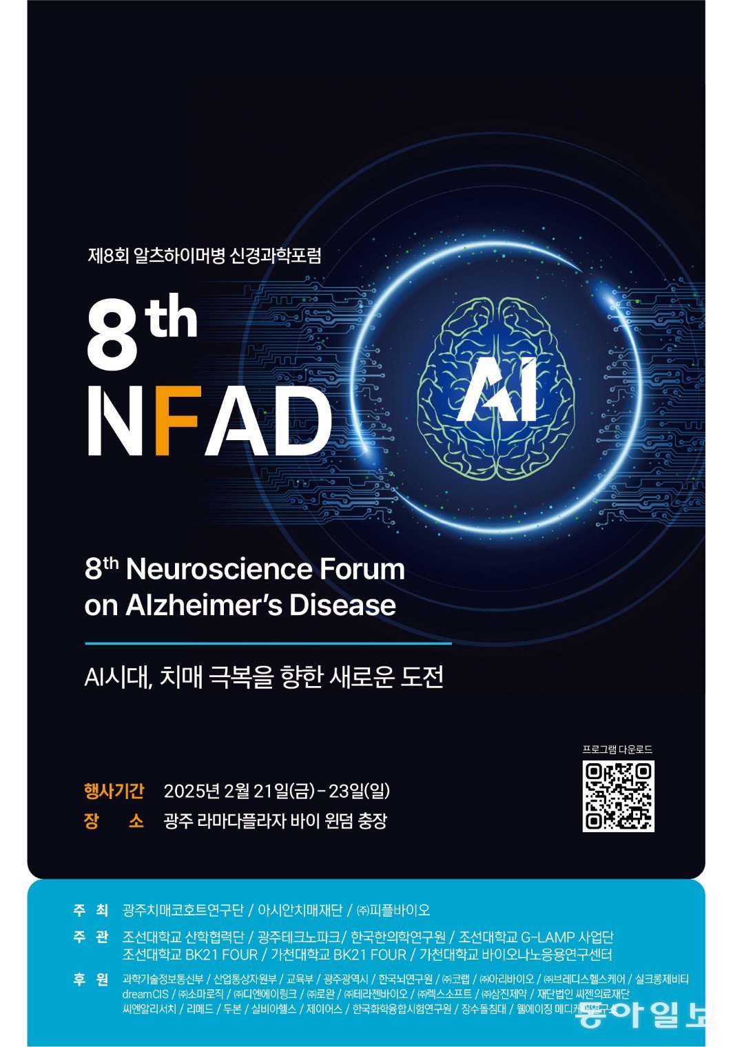 제8회 알츠하이머병 신경과학포럼 포스터. 조선대 광주치매코호트연구단 제공조선대 광주치매코호트연구단과 아시안치매연구재단은 21일부터 3일간 광주 동구 라마다플라자 바이윈덤 충장에서 ‘인공지능(AI)시대, 치매 극복을 향한 새로운 도전’을 주제로 제8회 ‘치매 신경과학포럼’을 연다.