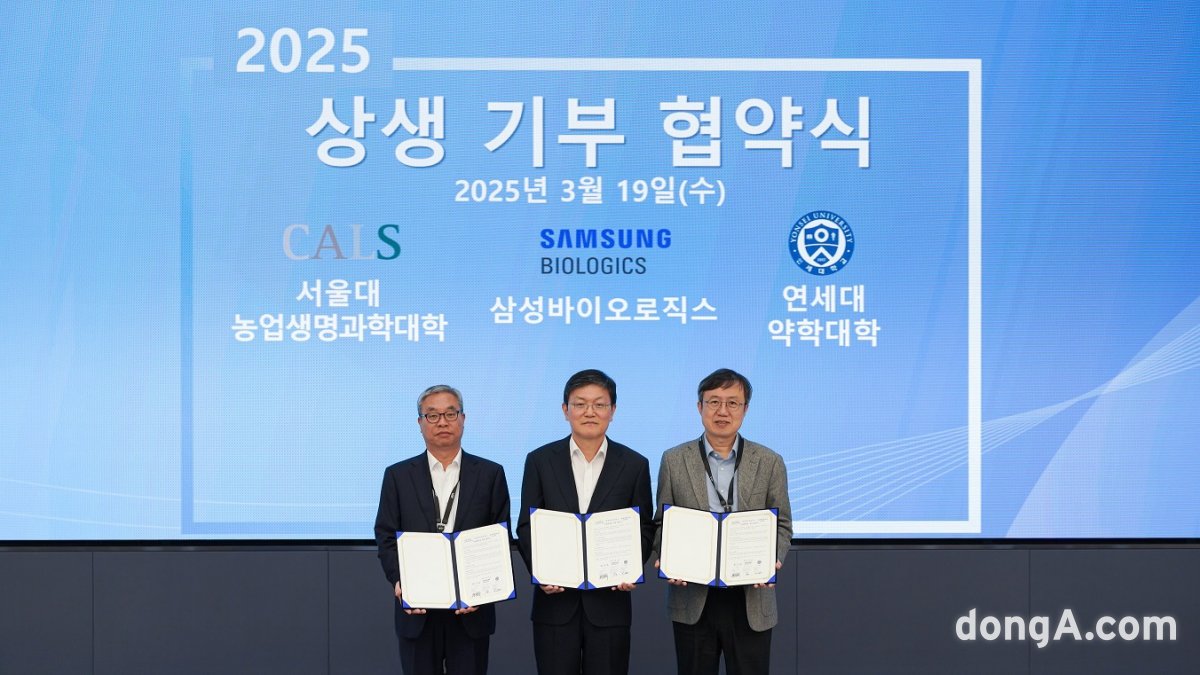 삼성바이오로직스가 서울대와 연세대에 바이오 원부자재를 기부하는 협약을 맺었다. 김동중 삼성바이오로직스 상생협력센터장 부사장(가운데)과 장판식 서울대 학장(왼쪽), 김익연 연세대 학장이 기념사진을 촬영하고 있다.삼성바이오로직스는 서울대 농업생명과학대학, 연세대 약학대학 등과 상생 기부 협약을 체결했다고 19일 밝혔다. 이날 인천 송도 소재 삼성바이오로직스 바이오플라자에서 열린 협약식에는 김동중 삼성바이오로직스 상생협력센터장 부사장을 비롯해 장판식 서울대 농업생명과학대학 학장, 김익연 연세대 약학대학 학장 등 주요 관계자들이 참석했다.