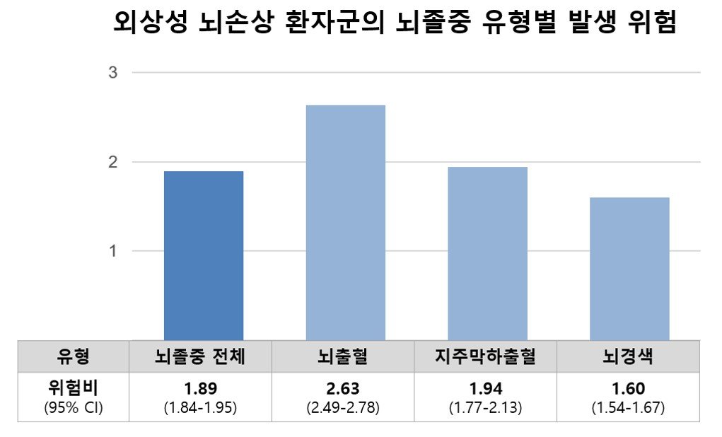 외상성 뇌손상 환자군, 뇌출혈 2.63배·지주막하출혈 1.94배·뇌경색 1.60배 증가