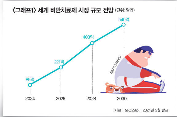 글로벌 투자은행(IB) 모건스탠리에 따르면 세계 비만치료제 시장 규모는 지난해 89억 달러(약 12조7000억 원)에서 2030년 540억 달러(약 77조5000억 원)까지 급성장할 것으로 전망된다(그래프1 참조). 세계보건기구(WHO)에 따르면 2022년 기준 세계 비만 인구는