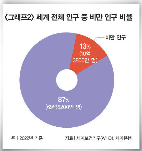 10억3800만 명으로 전체 인구(79억9000만 명)의 13%에 달한다(그래프2 참조).업계는 복용이 편리한 먹는 비만약이 출시되면 비만치료제 시장은 더욱 커질 것으로 보고 있다.