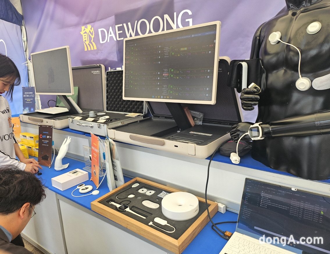 대웅제약 부스에 전시된 디지털 헬스케어 솔루션이와 함께 웨어러블 심전도 기기 ‘모비케어(mobiCARE)’와 반지형 연속혈압 측정기 ‘카트비피 프로(CART BP Pro)’, 연속혈당측정기 ‘프리스타일 리브레(FreeStyle Libre)’ 등 디지털 기술을 활용한 실시간 건강 모니터링 기기도 전시했다.