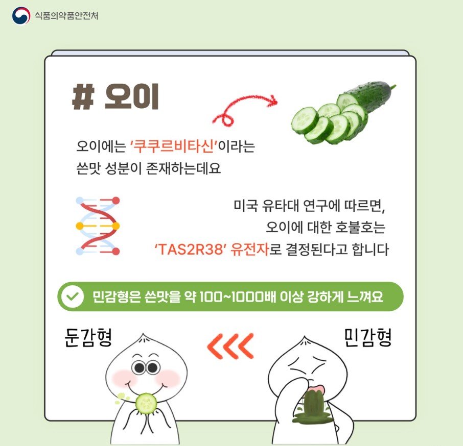 오이에는 ’쿠쿠르비타신‘이라는 쓴맛 성분이 있다. 식약처는 미국 유타대 연구를 인용해 오이에 대한 호불호는 TAS2R38 유전자’로 결정된다고 설명했다.