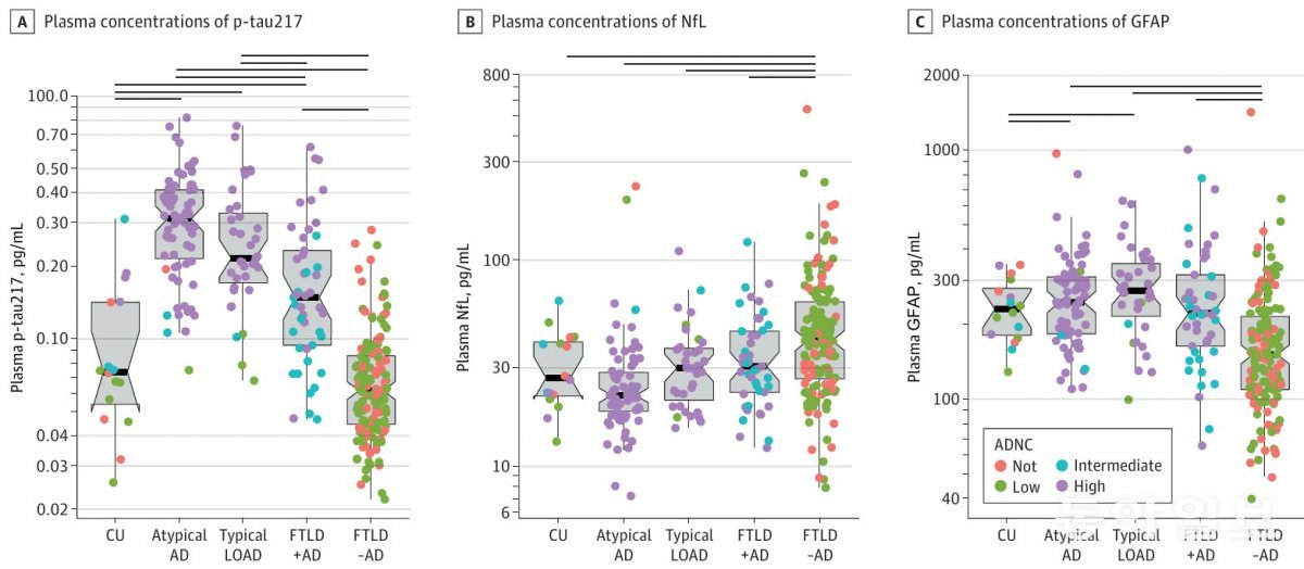그 결과, 사후에 측정된 혈액검사에서 알츠하이머병 환자군이 가진 p-tau217 농도(평균 0.28 pg/mL)가 전두측두엽 치매 환자(평균 0.10 pg/mL)보다 높게 나왔다. 알츠하이머병이 동반된 전두측두엽 치매 환자가 보인 p-tau217 농도(평균 0.19 pg/mL)도 알츠하이머병이 없는 경우(평균 0.07 pg/mL)보다 유의미하게 높았다.