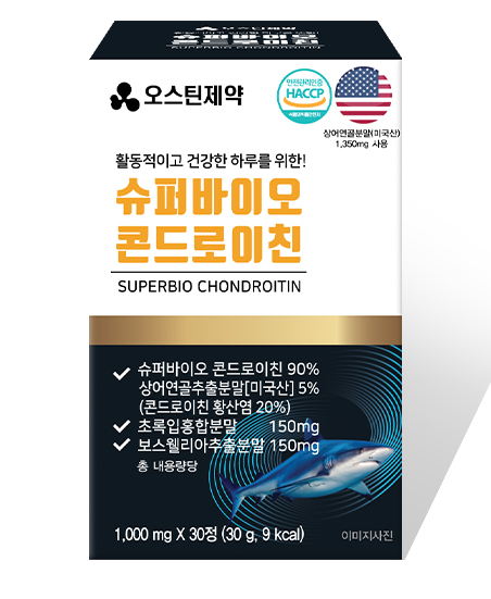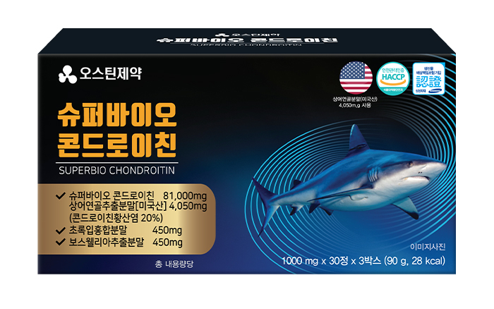 오스틴제약 슈퍼바이오 콘드로이친은 미국산 상어연골추출분말(슈퍼바이오 콘드로이친 90% 함유) 외에 초록입홍합분말·해조칼슘·우슬추출분말·글루코사민황산염·보스웰리아추출분말·산화아연 등 엄선한 9가지 부원료를 황금 배합해 빈틈없이 꽉 채운 제품이라고 관계자는 전했다.