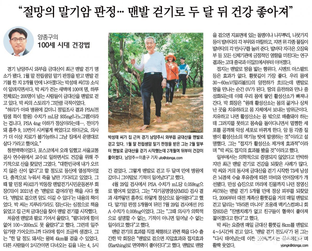 2020년 9월 26일 “간암 말기 환자 ’완치‘ 기적”…맨발걷기의 놀라운 효과, 2021년 5월 11일 “맨발걷기, 코로나 예방 치유에 효과 있다”, 2022년 9월 10일 “말기암 판정 2개월 만에 완치…맨발걷기가 기적 만들어”, 2023년 8월 12일 “맨발걷기로 파킨슨병 호전, 치매 예방에도 도움이 됩니다”,2024년 1월 27일 “맨발로 걸어 몸이 좋아졌죠…겨울엔 비닐하우스에서 걸어요”, “맨발로 해변을 걷고 29년 앓은 전신 근육강직 인간 증후군이 호전됐어요”