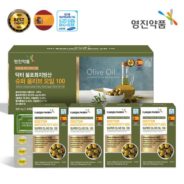 영진약품 슈퍼 올리브 오일은 신선하고 순도 높은 엑스트라버진 등급의 고품질 스페인산 올리브오일 100%로 불포화지방산인 올레산이 70∼80%로 풍부하다. 건강한 지방으로 알려진 불포화지방산을 5만916㎎ 함유하고 있으며 하루 단 1알로 기름진 음식도 마음껏 즐길 수 있다고 소개했다.