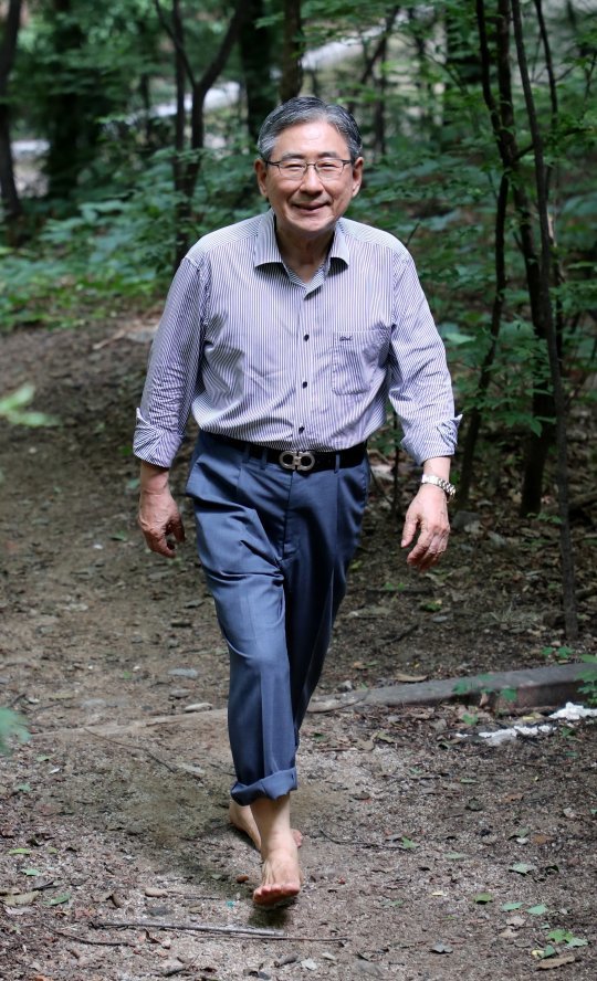 원종연 씨가 경기 파주시 아동동 학령산에서 맨발 걷기를 하고 있다. 파주=양종구 기자 yjongk@donga.com맨발로 맨땅을 걸으면 지표면에 놓여 있는 돌멩이나 나무뿌리, 나뭇가지 등 다양한 물질이 발바닥의 각 부위와 상호마찰하고, 땅과 그 위에 놓인 각종 물질이 발바닥의 각 반사구를 눌러준다. 자연 지압인 것이다. 한의학에서도 맨발 걷기를 권장하고 있다.