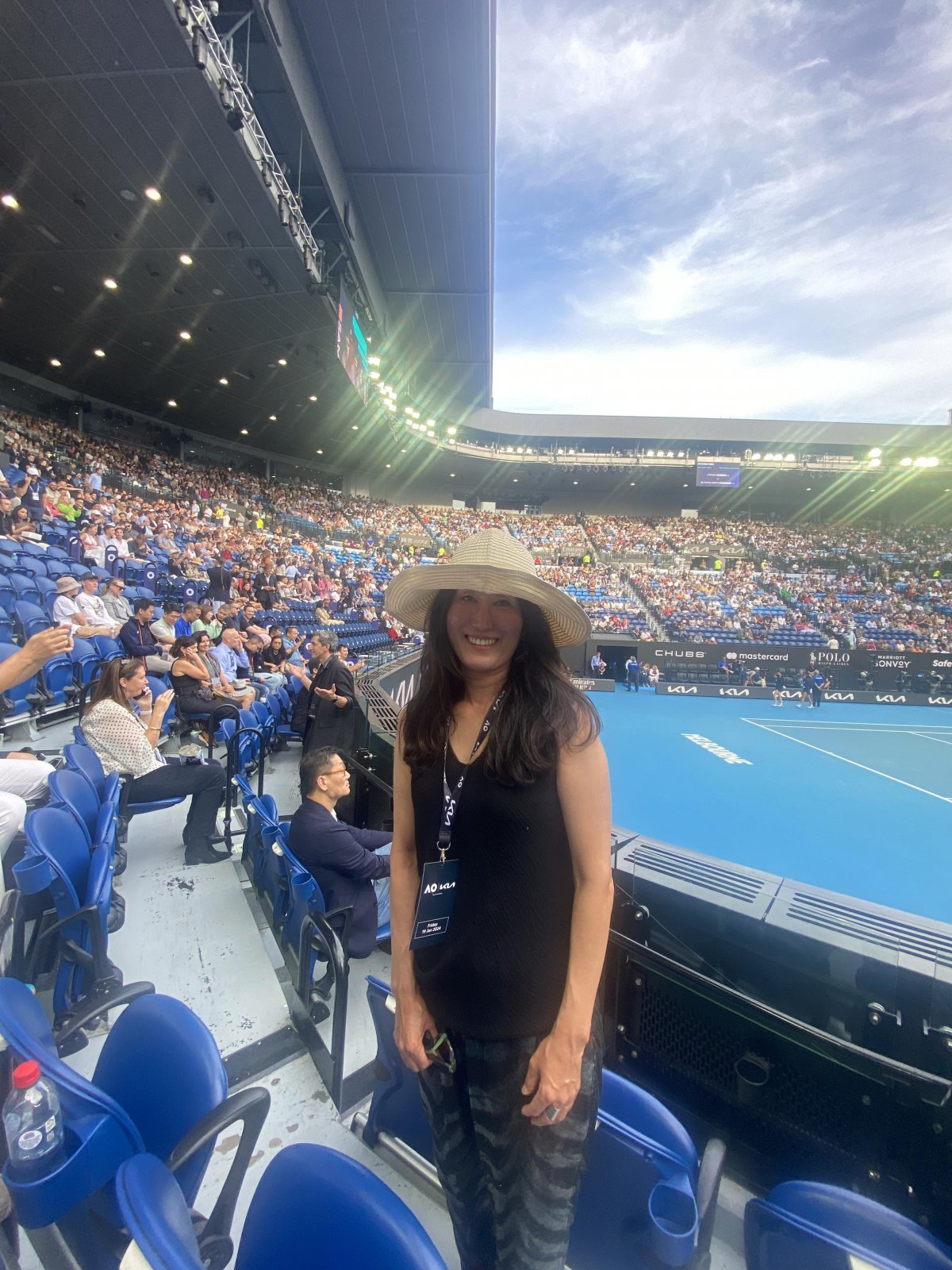 박진경 교수가 세계 메이저 테니스대회의 하나인 호주 오픈을 관전하다 포즈를 취했다. 박 교수는 2023년부터 2024년까지 호주국립대 한국학연구소 초빙교수로 있으면서 호주 오픈을 현장에서 지켜봤다. 박진경 교수 제공.“대학 때부터 제가 테니스 선수론 실패했다고 판단하고 사실상 테니스랑 이별을 선언했죠. 다른 길로 가야 한다는 생각이 컸어요. 테니스를 전혀 치지 않았어요. 그런데 유학하러 가서 장학금을 받아야 하는데 테니스 수업을 해주면 좀 더 쉽게 받을 수 있었죠. 그래서 수업을 해주긴 했지만, 테니스에 열정적으로 매달리진 않았어요. 지인들이랑 따로 테니스를 치지는 않았거든요.”