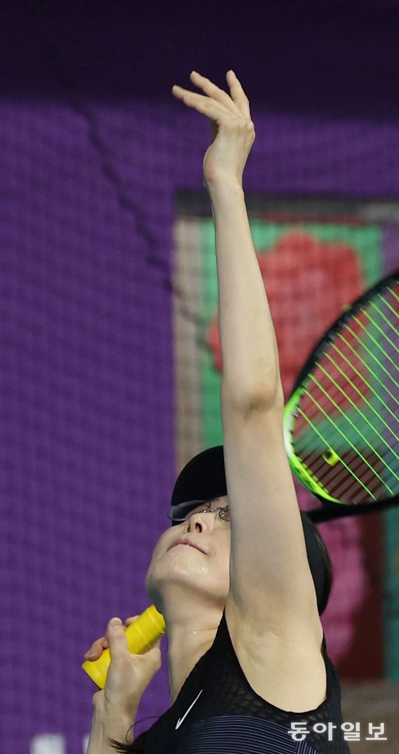 박진경 교수가 서울 구로구 고척동 귀뚜라미클린테니스코트에서 서비스를 날리려 하고 있다. 신원건 기자 laputa@donga.com“테니스가 겉으로 보기엔 화려해 보이지만 제일 중요한 게 체력과 뛰는 겁니다. 뭐든 기본이 잘돼 있어야 합니다. 테니스도, 연구도 마찬가지입니다. 기본기에 충실하면 중간 이상은 합니다. 유학 시절 테니스가 절 살렸다고 생각해요. 라켓으로 공을 치다 보면 온갖 스트레스가 날아가요. 재충전되는 느낌이랄까. 회원들과 어우러져 치는 것 그 자체로도 너무 재밌어요. 체력이 좋아져 연구에 집중도 잘 되죠. 제 또래에선 제가 체력이 가장 좋아요. 이런 테니스를 이젠 평생 절대 놓을 수 없죠.”