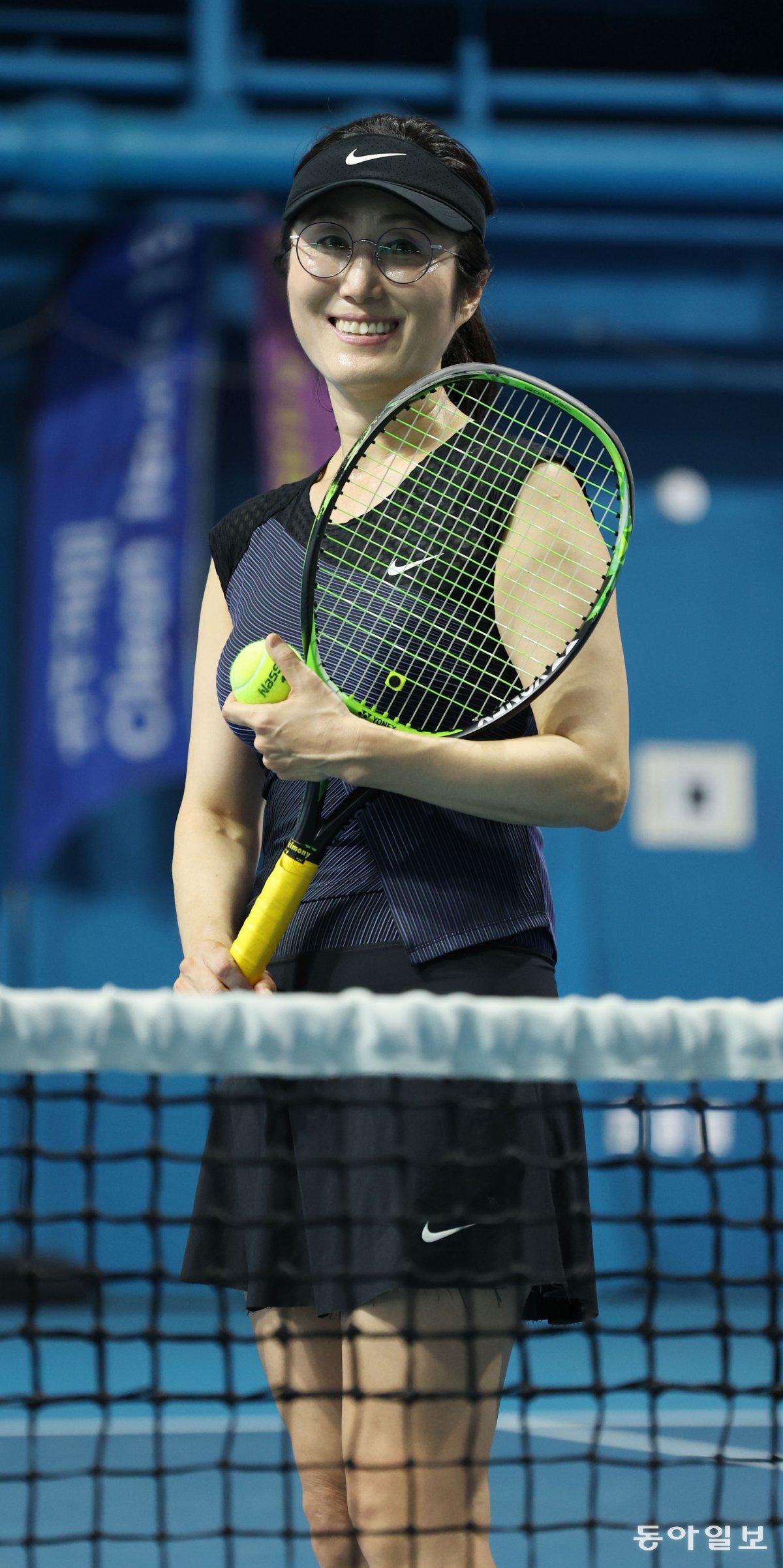 박진경 한국외국어대 국제지역대학원 교수가 서울 구로구 고척동 귀뚜라미클린테니스코트에서 라켓과 공을 들고 밝게 웃고 있다. 신원건 기자 laputa@donga.com