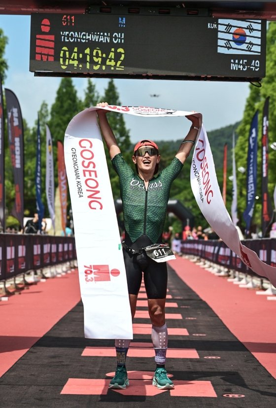 오영환 코치가 경남 고성에서 열린 철인3종 하프코스에 출전해 완주한 뒤 포효하고 있다. 오영환 코치 제공.“그때부터 철인3종에 빠졌어요. 재밌었죠. 힘들지만 포기하지 않고 끝까지 완주한 뒤 느끼는 희열감이 좋았어요. 수영과 사이클, 마라톤이 다 특색이 다르잖아요. 어느 하나만 잘해야 하는 게 아니죠. 그게 저의 승부욕을 더 자극했습니다.”
