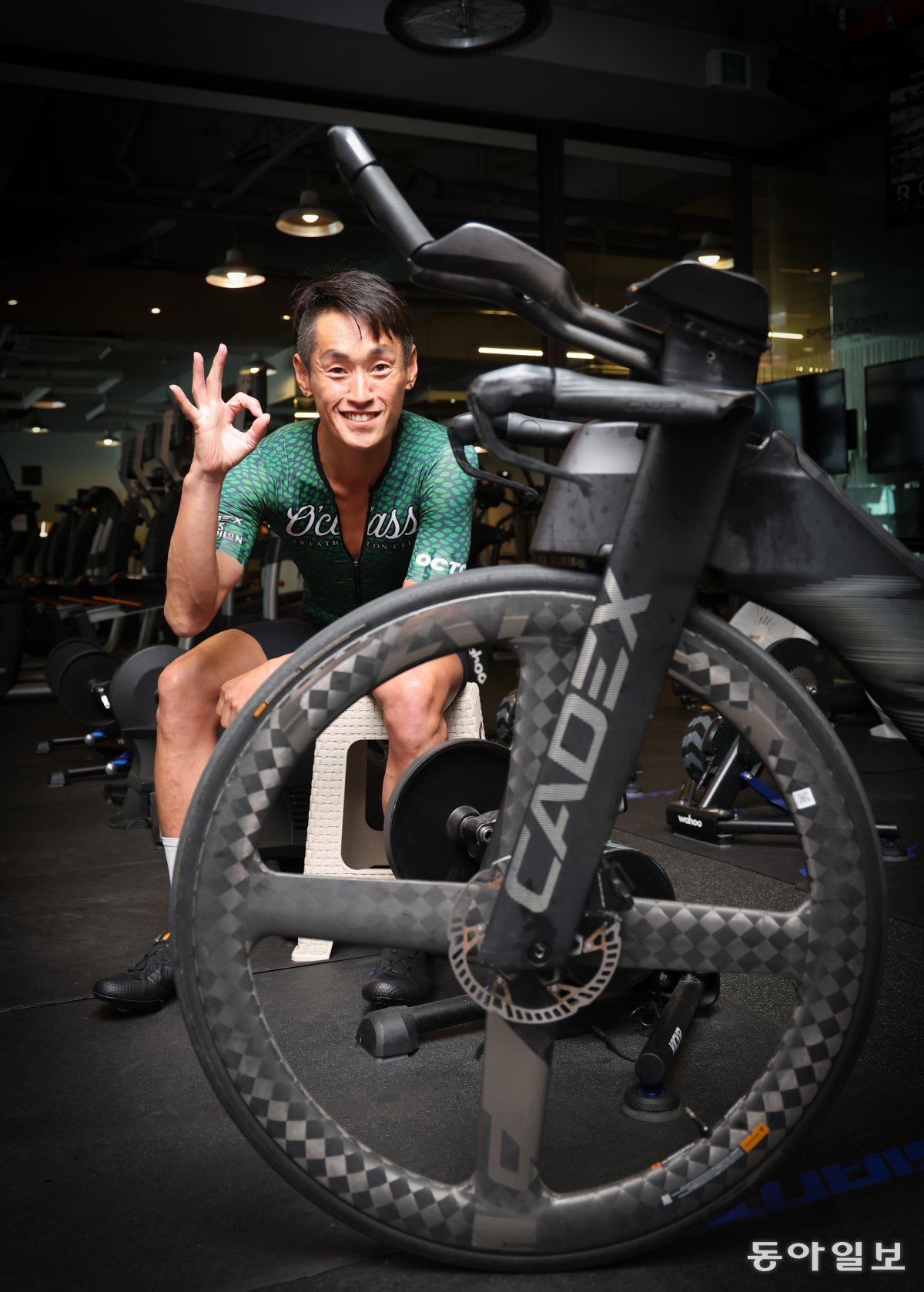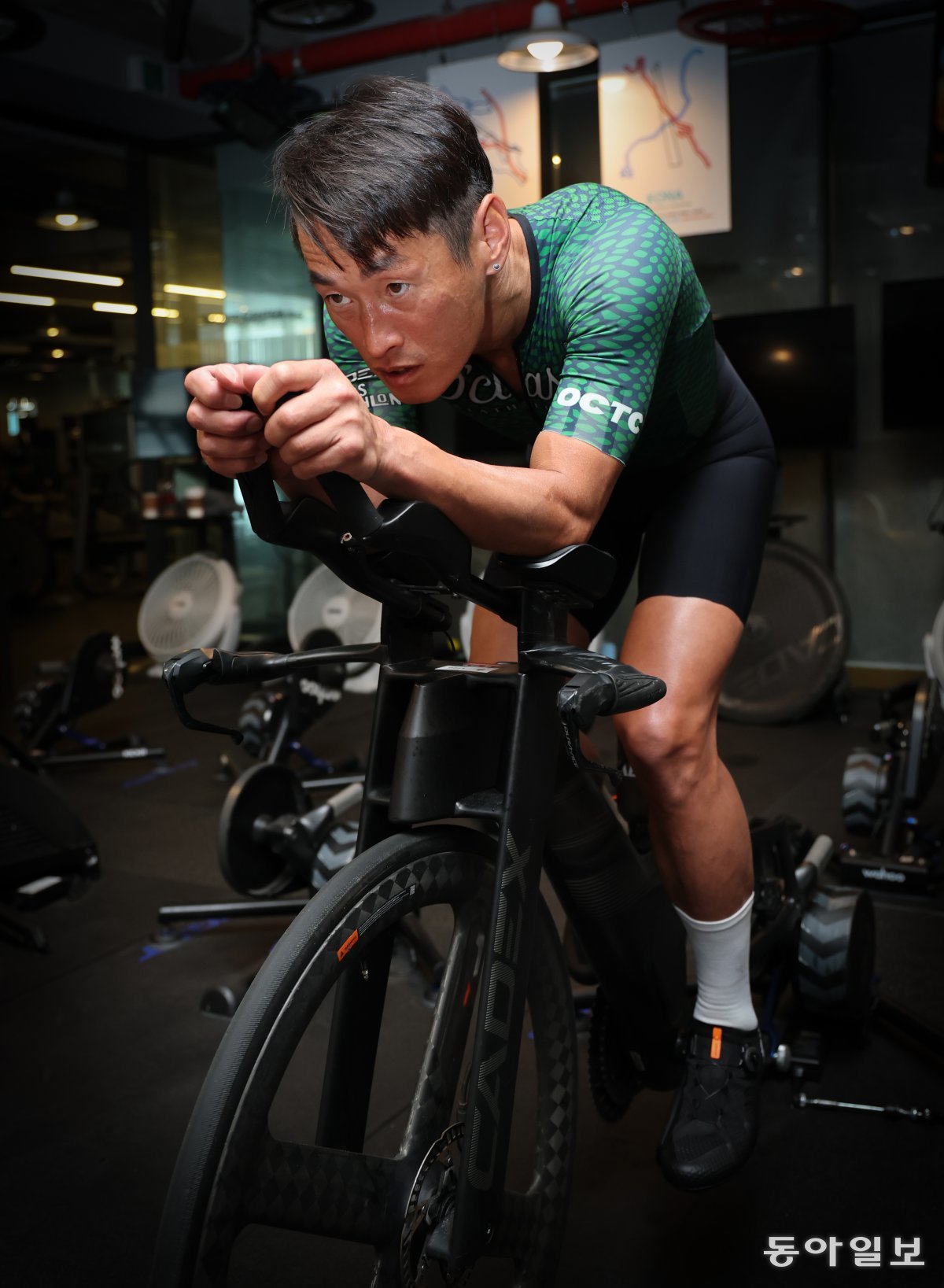 오영환 오클래스 코치가 서울 강남구 더논현스포츠센터에서 사이클 훈련을 하고 있다. 홍진환 기자 jean@donga.com“바다 수영은 스윔 슈트가 있어야 하는데 없었죠. 그래서 사촌 형의 스킨스쿠버 슈트를 빌려 갔더니 안 된다고 하더군요. 어쩔 수 없이 수영복만 입고 입수했죠. 출발부터 수경이 벗겨졌고, 자유형, 배영, 평영 등을 번갈아 하다 간신히 완영했죠. 달리기는 수영보다는 쉽게 완주했어요.”