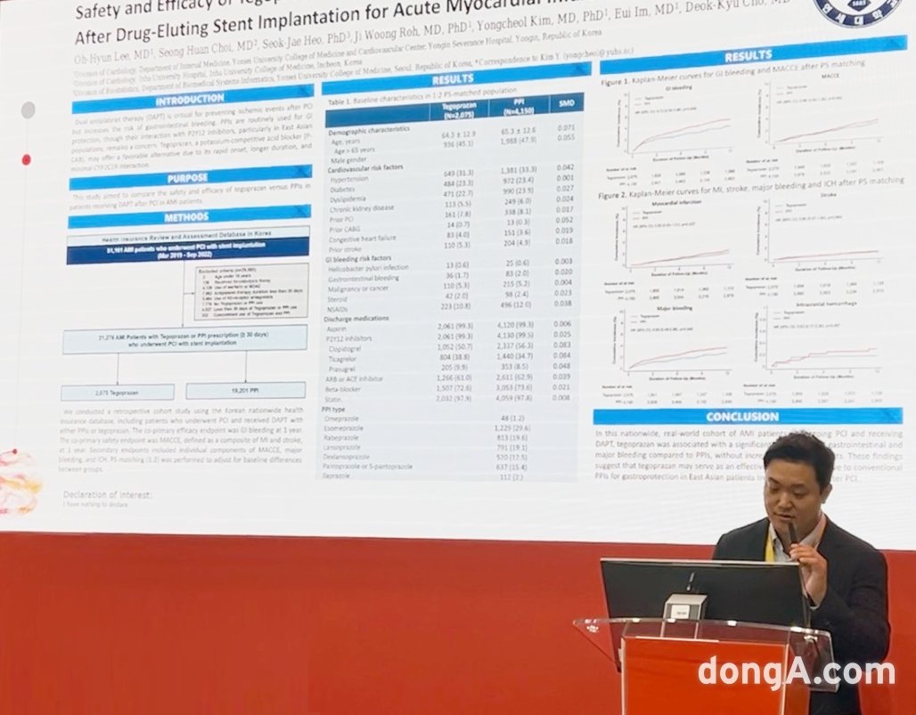 이오현 용인 세브란스병원 심장내과 교수가 케이캡 연구결과를 발표하고 있다.연구를 주도한 김용철 용인 세브란스병원 심장내과 교수는 “DAPT 치료를 받는 동아시아 심근경색 환자에서 케이캡이 기존 PPI 대비 효과적이고 안전한 위장보호약물이 될 수 있다는 것을 확인했다”고 설명했다. 이오현 교수는 “초고령화 사회에 접어들면서 심혈관 질환 환자가 늘어나고 있고 사망률도 증가하고 있다”며 “특히 시술 후 DAPT 치료 과정에서 발생하는 위장관 출혈 관리가 중요한데 이번 연구결과는 케이캡이 안전하면서 효과적인 대안이 될 수 있다는 것을 보여준다”고 말했다.