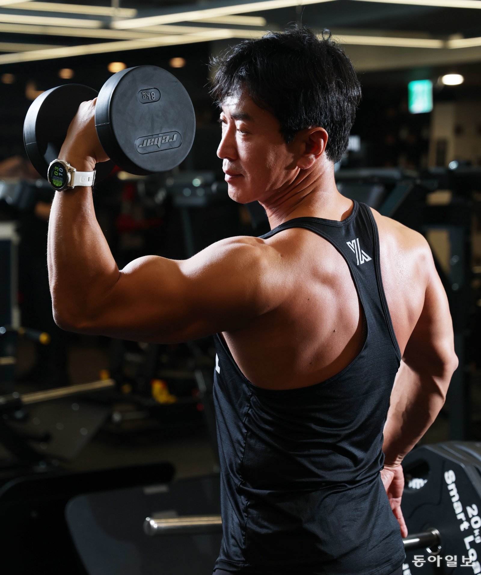 최재완 원장이 서울 중구 삼일대로 피트니스101에서 근육하고 있다. 완쪽 이두박근의 장두가 끊어졌지만 수술 없이 꾸준한 운동으로 근육 볼륨을 키웠다. 신원건 기자 laputa@donga.com“이두박근을 다친 뒤 시간이 없어 1년여 왼쪽 팔 운동을 못했는데 재활 전문 트레이너가 ‘재활훈련으로 주변 근육이 훨씬 강한 힘을 내도록 만들면 된다’고 했죠. 처음엔 의아했지만 진짜 계속 운동하니 다시 근육이 잡혔어요. 끊어진 장두가 이어진 것은 아닌데 단두 하나만으로 예전의 힘을 쓸 수 있게 된 겁니다. 전체적인 근육의 크기도 커졌죠. 그때 운동에 대해 제대로 공부해야겠다고 생각했습니다.”
