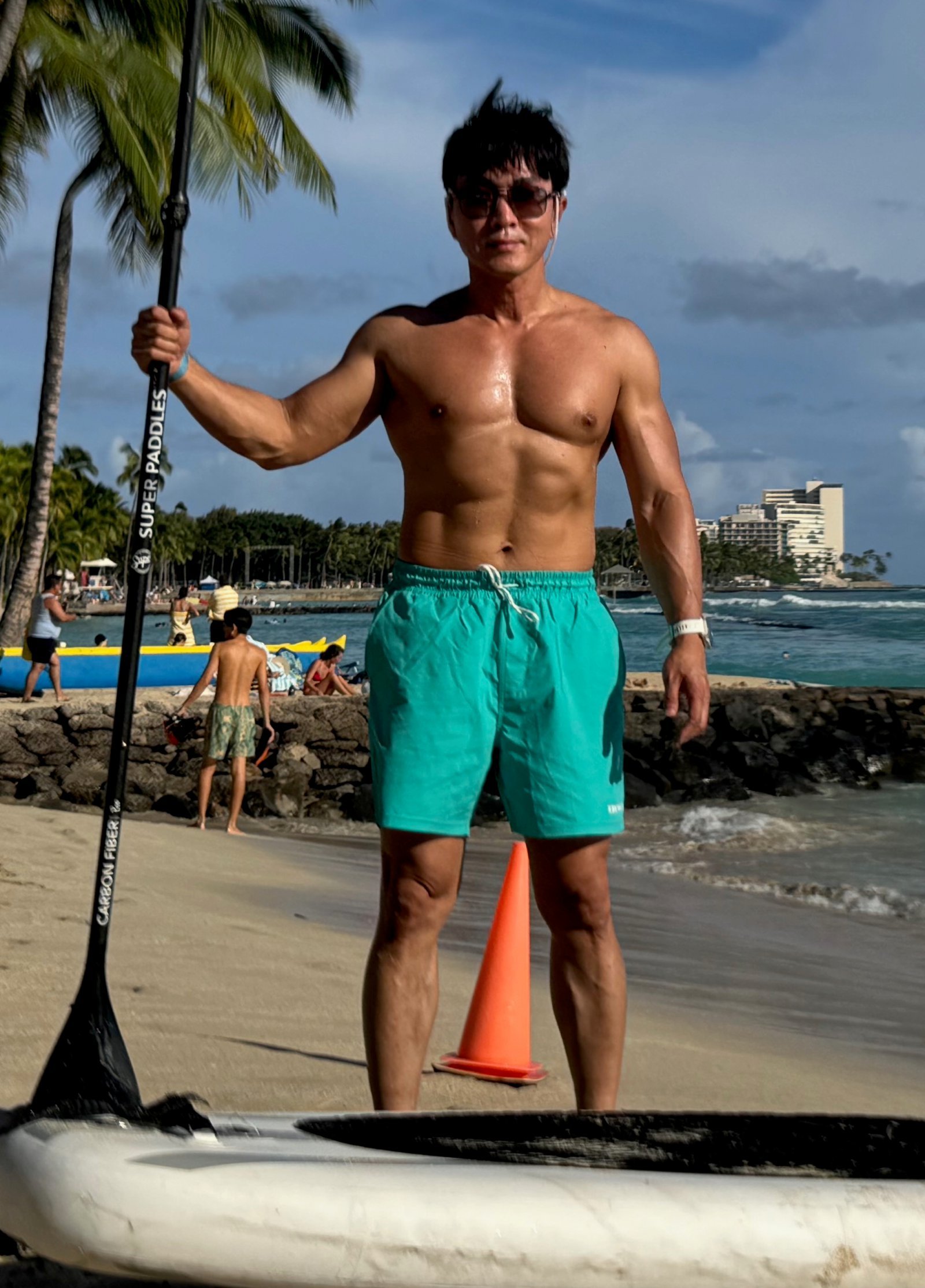 최재완 원장이 패들보트를 타다 포즈를 취했다. 최재완 원장 제공.최 원장은 보디빌딩 대회 출전도 준비하고 있다. 대학 시절 이후 첫 도전이다. 그는 “대회에 출전하려면 3개월 이상은 훈련도 체계적으로 해야 하고, 다이어트도 병행해야 한다. 그동안 병원 일을 이유로 미뤄왔는데 대회 출전을 통해 배우는 것도 많을 것 같다”고 했다. 올 연말부터 준비해 내년에 출전할 계획이다.