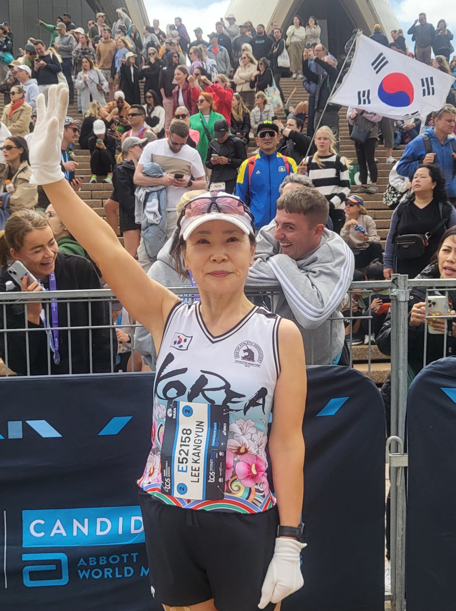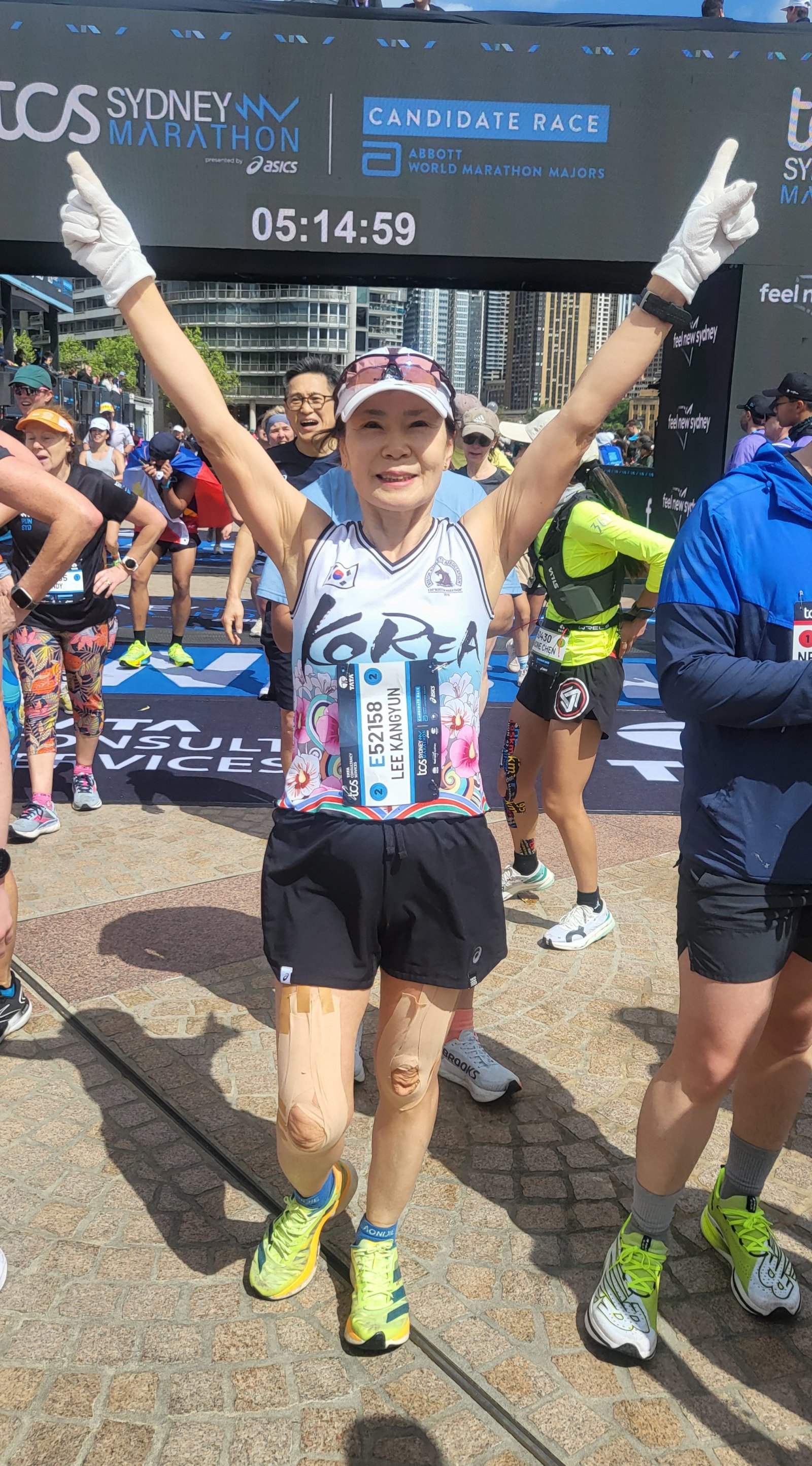 이강연 씨가 지난해 9월 열린 호주 시드니마라톤을 완주한 뒤 포즈를 취했다. 4시간 11분 5초로 완주했다. 이강연 씨 제공.마라톤을 본격적으로 시작하고 얼마 안 돼 남편이 세상을 떠났다. 그래서 생업(서울 동대문구 장안동 동의보쌈)을 시작할 수밖에 없었다. 그는 “그때 달리기 없었으면 버텨내지 못했을 것”이라고 했다. 새벽 4, 5시에 식당에 나가 장사 준비하고 나가서 달렸다. 그는 “고기 삼고, 김치 담고, 반찬 준비하면 두세 시간 훌쩍 지나간다. 준비 마치고 허리를 펴면 잘 펴지지 않아 손으로 지지할 것을 잡고 일어나야 한다. 그래도 달리고 나면 모든 피로가 날아가고, 기분이 좋았다”고 했다.