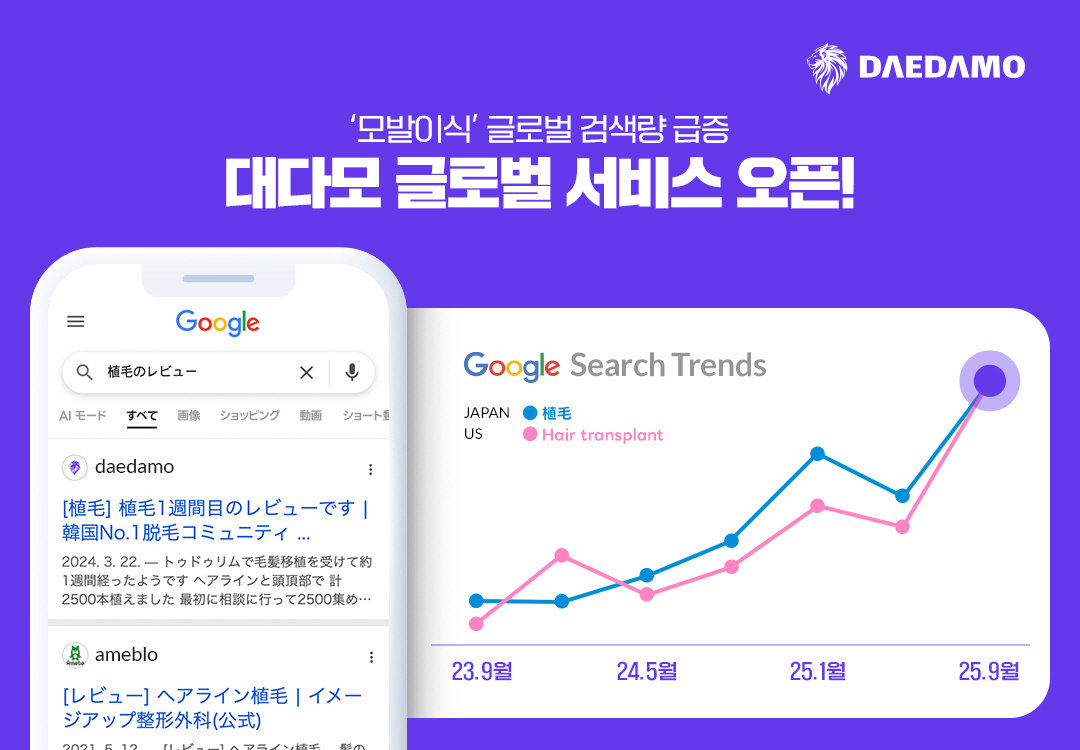 글로벌 검색 서비스 구글의 트렌드 통계에 따르면 미국, 일본의 모발이식 검색량은 지속적으로 상향하고 있으며 2025년 8월 첫째 주에는 2023년 대비 일본, 미국 모두 96% 이상의 폭발적인 증가율을 보였다.