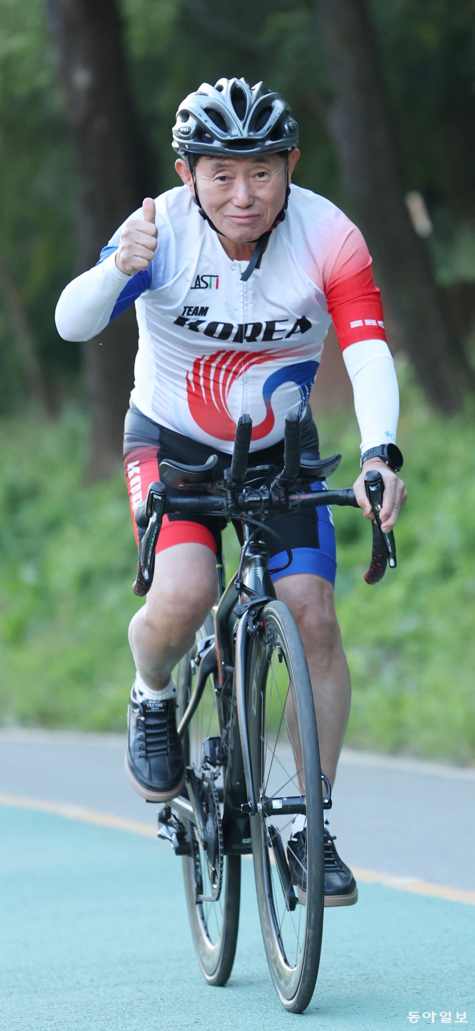 강준환 원장이 서울 강남 양재천에서 사이클을 타고 달리며 ‘엄지척’을 하고 있다. 신원건 기자 laputa@donga.com“수영은 호흡 트는 게 중요합니다. 1km 이상 장거리 수영할 때 호흡 부담 없이 갈 수 있는 것을 말합니다. 전 빠르진 않지만, 천천히 오래가는 능력을 일찌감치 키웠습니다. 나중에 이 능력이 철인3종 할 때 큰 장점이 됐습니다. 사이클과 마라톤을 잘하면서도 수영 때문에 철인3종 완주 못 하는 사람들 많거든요.”