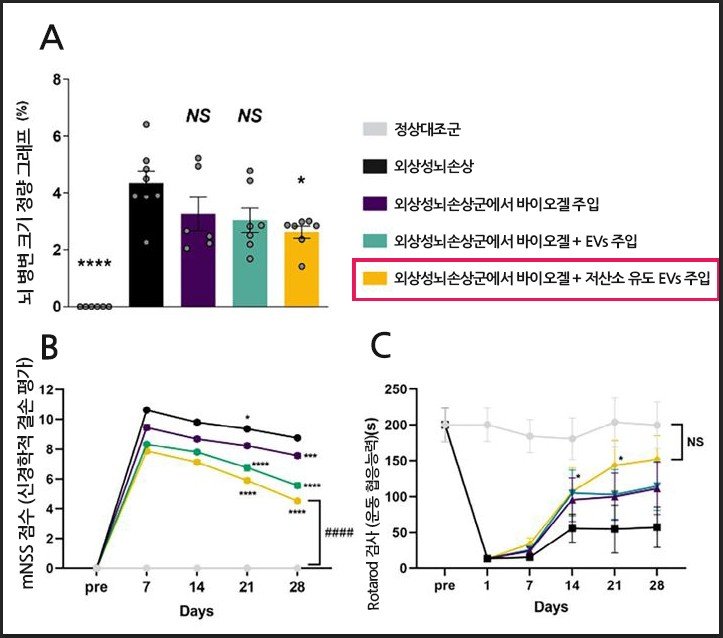 연구 결과 외상성 뇌손상 모델에서 하이드로젤(BIOGEL)-EV 복합체를 주입한 결과, 손상된 뇌 조직의 병변 크기가 40% 이상 감소, 신경세포 재생과 축삭(신경 연결부) 재형성, 혈관 재생 및 염증 억제, 운동 및 인지 기능의 회복이 확인됐다.