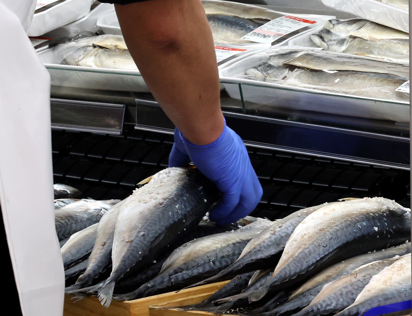 24일 오전 서울의 한 대형마트에서 직원이 고등어를 진열하고 있다. 한국해양수산개발원에 따르면 지난달 고등어 생산량은 전월 대비 72.5% 급감한 5,608톤으로 집계되었다. 이는 평년 대비도 38.1% 줄어든 수치로, 조업 일수 감소와 기상 악화가 주요 원인으로 지목되었다. 산지 가격은 고등어 ㎏당 5,937원(전월比 +28.4%), 갈치는 ㎏당 2만4,200원(전월比 +32.7%)으로 상승했다. 2025.03.24. [서울=뉴시스] 상한 고등어 등 등푸른생성류를 섭취하고 구역질, 두드러기, 가려움 등이 발생하면 식중독이 아닌 세균이 감염된 독소로 발생한 급성 중독 질환일 수 있어 주의가 필요하다.