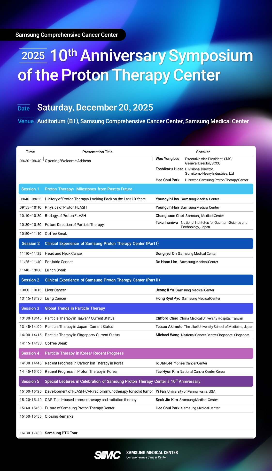 박희철 양성자치료센터장은 “삼성서울병원의 양성자 치료 10년 역사는 적극적인 연구로 치료 효과를 입증하고, 다학제팀이 합심해 최적의 치료를 찾고자 노력한 결과”라며 “이번 심포지엄에서 논의되는 플래시 기술 개발과 면역항암요법 등을 통해 암 환자 완치의 희망을 주는 새로운 길을 찾아가겠다”고 밝혔다.