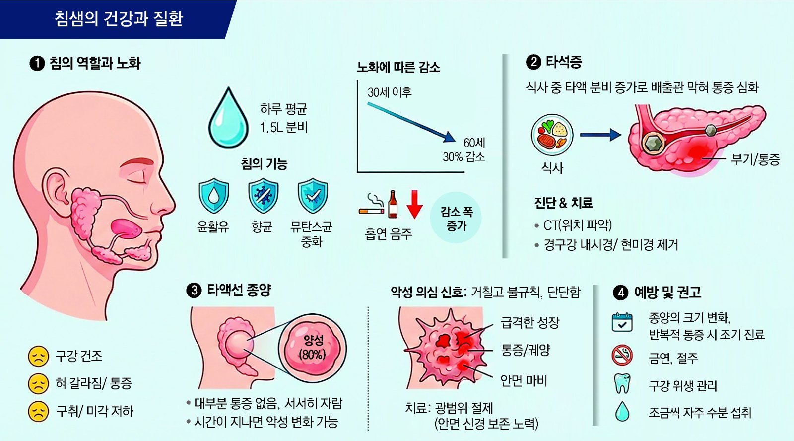 최종욱 관악이비인후과 대표원장. 침 분비량은 나이가 들수록 줄어든다. 흡연이나 음주가 잦을 경우 감소 폭은 더 커진다. 침이 줄면 구강은 쉽게 건조해지고 혀 표면이 갈라지며 통증이나 작열감을 느끼기도 한다. 양회성 기자 yohan@donga.com침은 하루 평균 1.5ℓ가 분비된다. 음식물을 씹고 삼키는 과정을 돕는 윤활유 역할을 할 뿐 아니라 침 속에 들어 있는 라이소자임과 락토페린, 면역글로불린 (IgA)은 구강 내 세균 증식을 억제해 감염을 막는다. 충치의 원인균으로 알려진 뮤탄스균을 중화하는 기능도 침이 맡는다. 하지만 침 분비량은 나이가 들수록 줄어든다. 30세 이후 매년 약 1%씩 감소해 60세가 되면 30%가량 줄어든다. 흡연이나 음주가 잦을 경우 감소 폭은 더 커진다. 침이 줄면 구강은 쉽게 건조해지고 혀 표면이 갈라지며 통증이나 작열감을 느끼기도 한다. 인후 이물감과 구취가 동반되고 음식 맛을 잘 느끼지 못하는 경우도 적지 않다. 고령층에서 침샘(타액선) 질환이 증가하는 배경이다.
