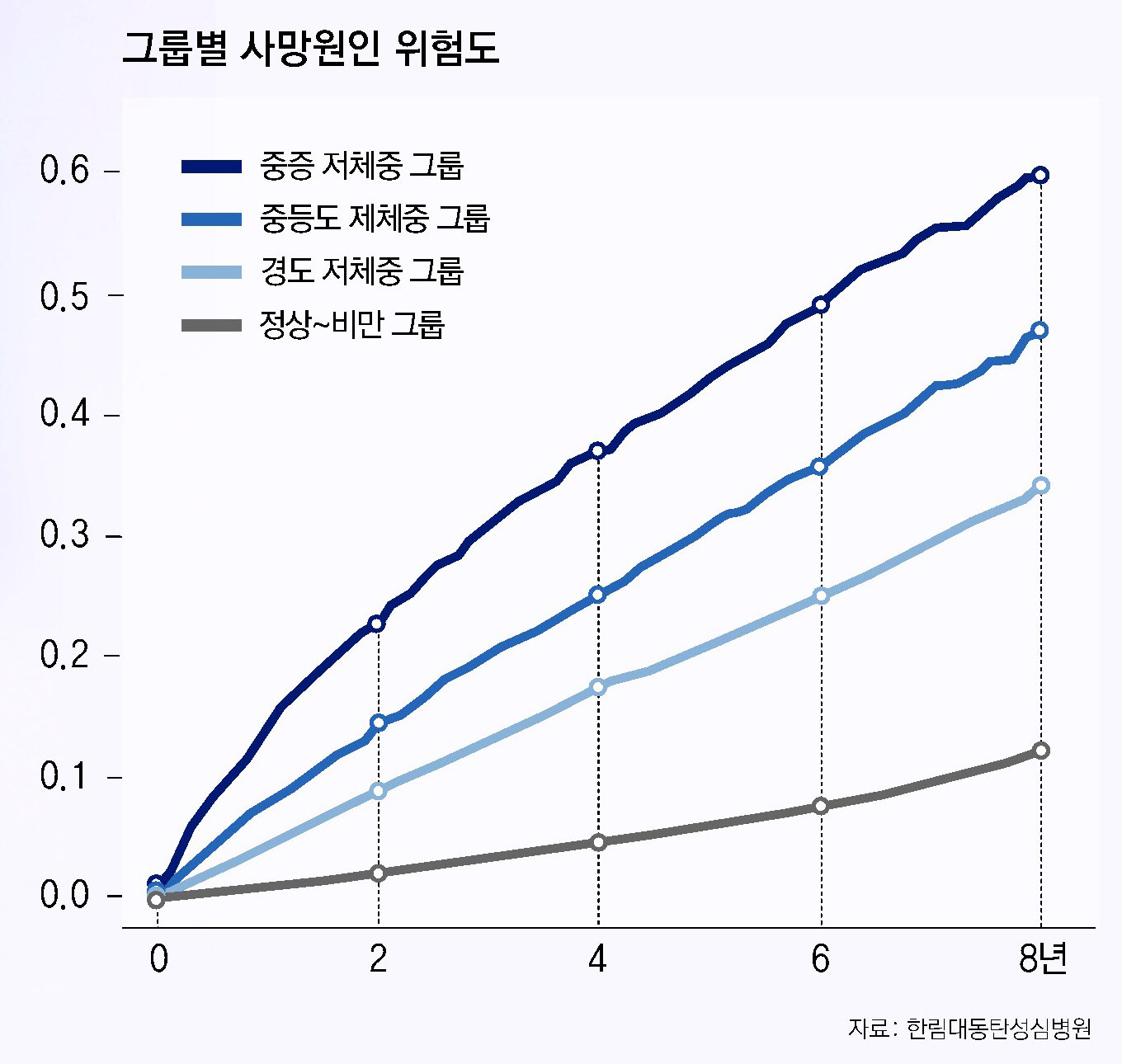 문제는 ‘저체중’이라는 반대 방향의 위험이다. 한림대동탄성심병원 내분비내과 홍은경·최훈지 교수, 강북삼성병원 내분비내과 문선준 교수, 숭실대 정보통계보험수리학과 한경도 교수 공동연구팀은 국민건강보험공단 데이터를 바탕으로 2015∼2016년 건강검진을 받은 40세 이상 2형 당뇨병 환자 178만8996명을 2022년까지 추적한 전국 후향적 코호트 연구를 발표했다. 연구팀은 체질량지수(BMI)를 기준으로 저체중을 세 단계(경도 17.0∼18.4㎏/㎡, 중등도 16.0∼16.9㎏/㎡, 중증<16.0㎏/㎡)로 나누고 정상부터 고도비만까지 그룹과 사망률을 비교했다.