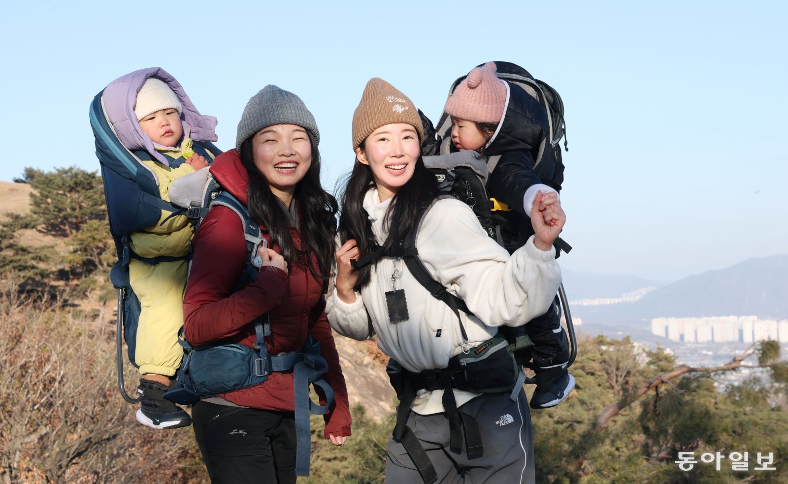 오언주 베이비하이킹클럽(베하클) 회장(왼쪽)과 김지영 씨가 각각 아들(인주호)과 딸(강다경)을 업고 서울 광진구 아차산 해맞이코스 해맞이광장에 올라 활짝 웃고 있다. 2024년 9월부터 베하클을 운영하는 둘은 “아이를 업거나 안고 산에 오르니 아이도 좋아하고 우리도 행복하다”고 입을 모았다. 신원건 기자 laputa@donga.com“솔직히 아이 업고 산을 오르는 게 힘들죠. 하지만 그 힘든 것을 참고 올랐을 때 더 큰 성취감을 느껴요. 스트레스가 확 날아가고 기분도 좋아지죠. 아이들과 함께 산에 오르면서 육아가 더 재밌어졌어요.”